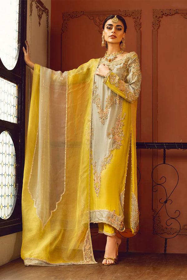 A timeless allure of organza and silk canvas, where Sage and Jade hues intertwine to create elegance. The shirt, is a testament to craftsmanship, adorned with intricate gold embroidery that mimics nature's delicate patterns. The shirt is a modern straight-cut silhouette with an elongated embellished neckline with its ethereal dupatta, a sheer masterpiece featuring delicate motifs mirroring the shirt's design. Together, this ensemble captures the essence of sophistication, seamlessly blending traditional charm with contemporary style for a captivating statement for festivities.