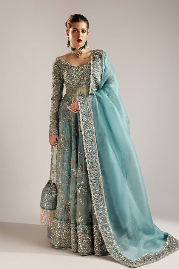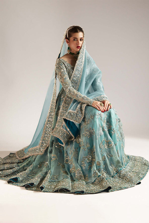 A dainty Ice-Blue silhouette, lavishly adorned with intricate embellishments on the front and back bodice, creates an alluring look. The opulent peshwas showcase heavy embellished borders, evoking a regal charm fit for royalty. Accompanying this divine piece is the resplendent silk crushed sharara, draping gracefully and exuding a fairy-tale like aura. Completing this enchanting ensemble is the digital printed dupatta, featuring celestial motifs in mesmerizing hues. Its four sided embellished border exudes an aura of ethereal elegance.