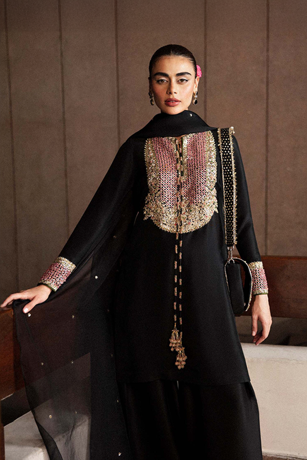 An absolute elegant black raw silk shirt with a heavily embellished neckline with tassels adding to the detail and beauty to this fit. Its paired with shalwar with colorful gota border and a beautiful printed organza dupatta filled with sequin spray. Pair our signature Hussain Rehar bag with it to complete this gracious outfit.