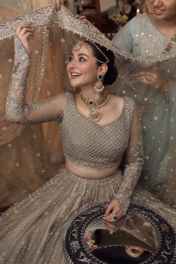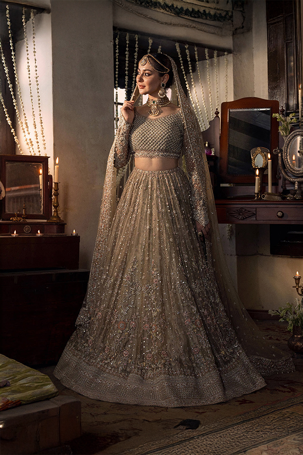 A three piece handworked beige bridal lehnga set featuring twinkling floral booti and stretched out vines on a glistening base of tissue.
