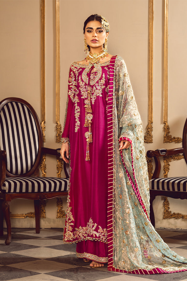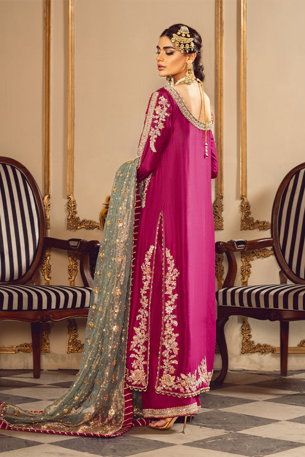 Melodic Tassels a Symphony of Opulence is crafted with meticulous care from pure raw silk, the shirt and pants radiate a lustrous sheen and boast a luxurious texture that enhances the overall allure of the ensemble. Melodic Tassels, with its Aqua Green dupatta, invites you to embrace the enchantment of color and texture. It is an ode to individuality and style, where every element comes together to form a harmonious composition, a melody that resonates with the modern spirit while paying homage to the richness of tradition.