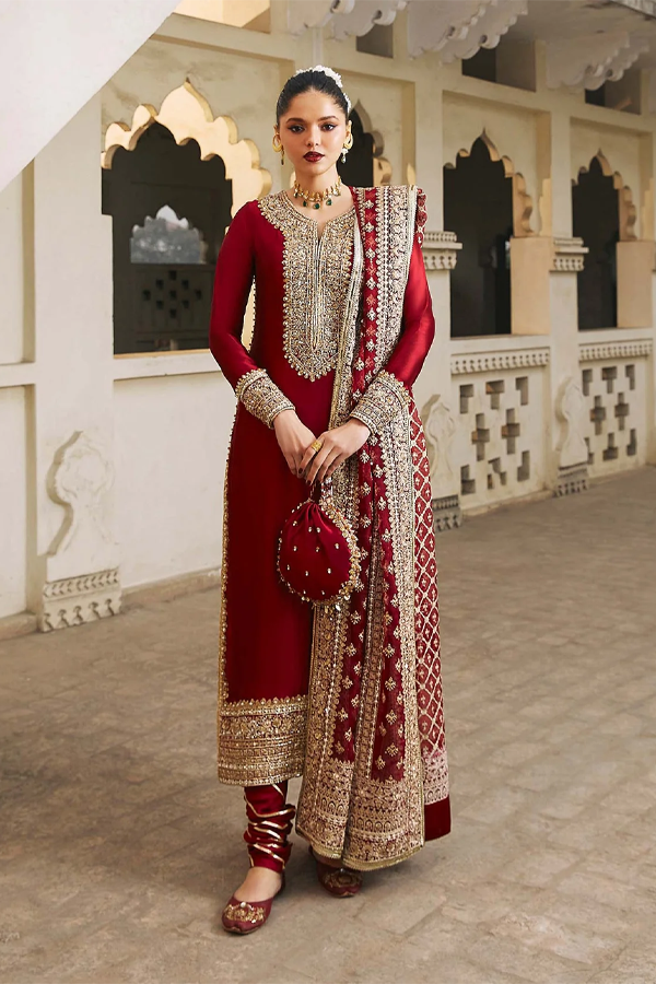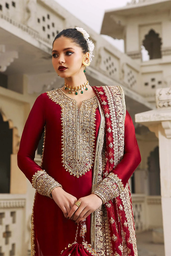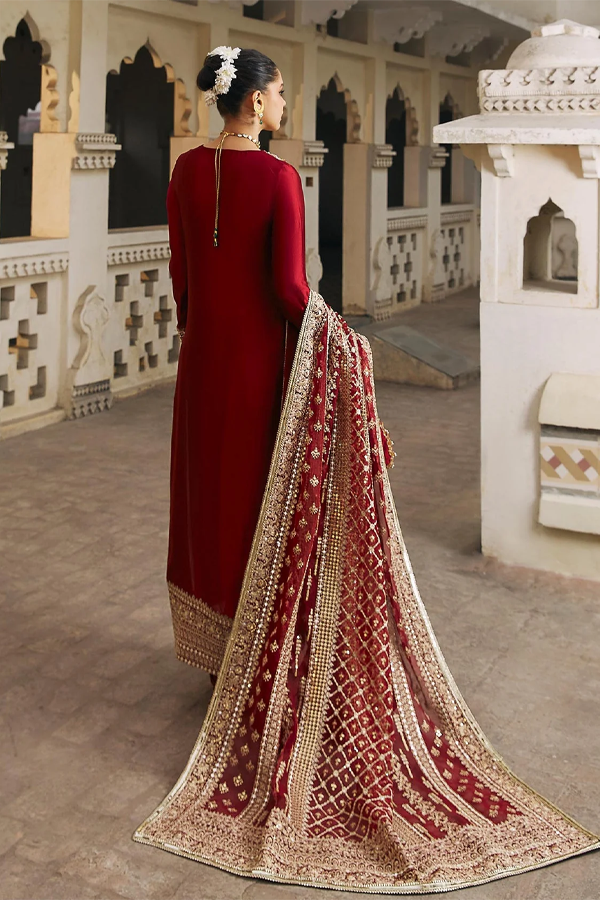 Indulge in the epitome of elegance with our exquisite long tissue silk shirt in a luxurious rich deep red tone. This opulent attire is a testament to timeless beauty, featuring intricate embroidered borders and a neckline that adds an extra layer of sophistication to its design. The meticulous craftsmanship is evident in the fine embellishments adorning the entire border of the shirt, creating a stunning visual feast. To elevate the ensemble further, the outfit is accompanied by a fully embroidered dupatta, adding a touch of glamour and completing the ensemble with finesse.