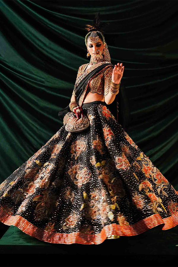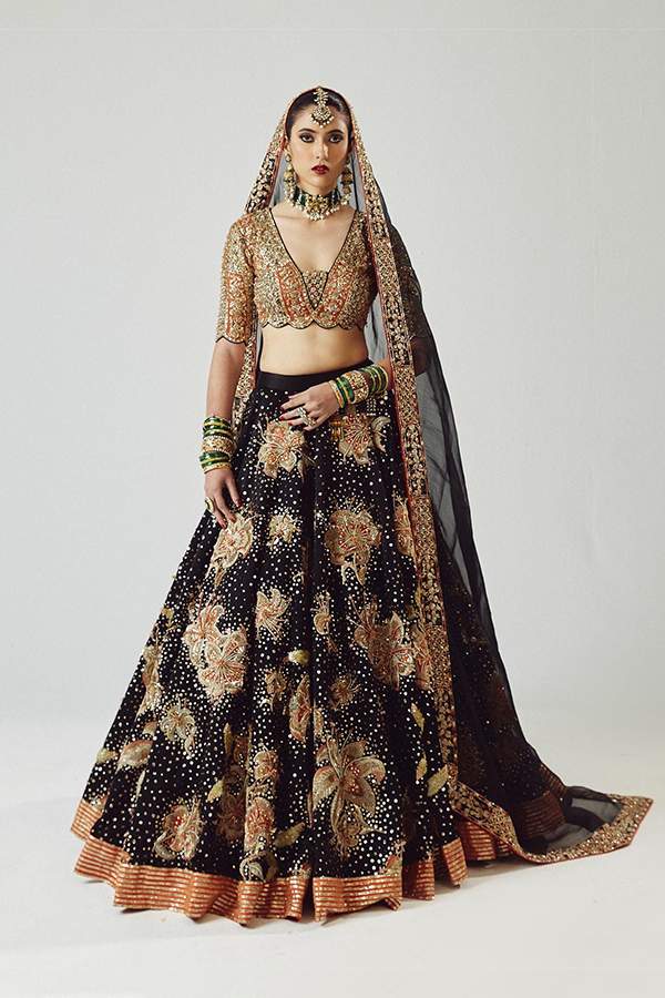 Feast your eyes on this stunning black pure satin silk lehenga, adorned with intricate rust patchwork lillies and sequins, Paired with a black pure organza dupatta, featuring captivating rust and black patchwork, choli that complements the ensemble flawlessly. This opulent combination exudes elegance and sophistication.